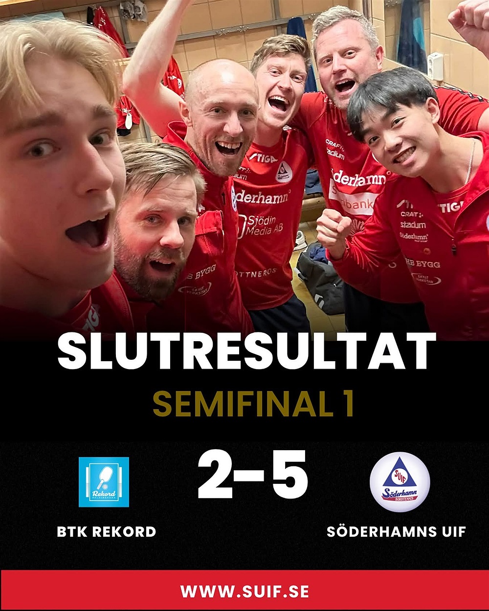Ett heltaggat SUIF fixade en skön seger när den första semifinalmatchen mot BTK Rekord avgjordes på måndagskvällen i Helsingborg. Våra återvändare Jon Persson och Jens Lundquist visade klass i sina segermatcher. Jon lovade för många år sedan SUIFs grundare och nu 94-årige Gösta Lööf att han skulle återvända och representera SUIF innan han lägger sin elitkarriär på hyllan. Jon som är rankad etta är en fantastisk lirare och lagspelare. Han vann sina matcher över både Rekords försteman Hampus Söderlund(3-2) och andreman Simon Arvidsson(3-0). Jens som med erfarenhet från två Olympiska spel ville inte vara sämre i sin återkomst till ett slutspel i den svenska Pingisligan. Senast Jens fanns med i SUIFs laguppställning var år 2001 när SUIFs 4e SM-guld bärgades i Söderhamns Idrottshall. På onsdag fyller vi hallen för returmatch mot BTK Rekord. Välkomna!